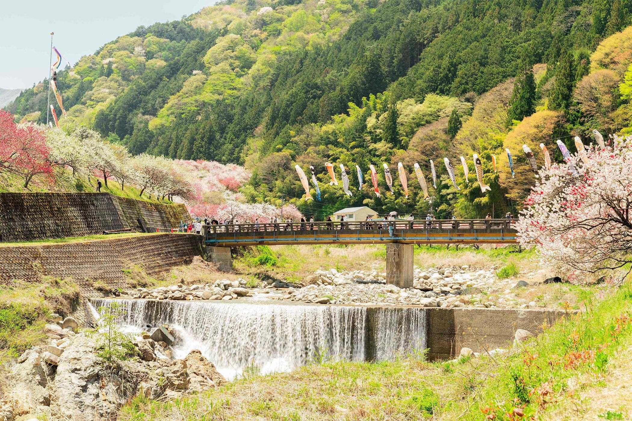 例年4月上旬~5月中旬になると、村を流れる川沿いに約10,000本の花桃が里を彩ります。
